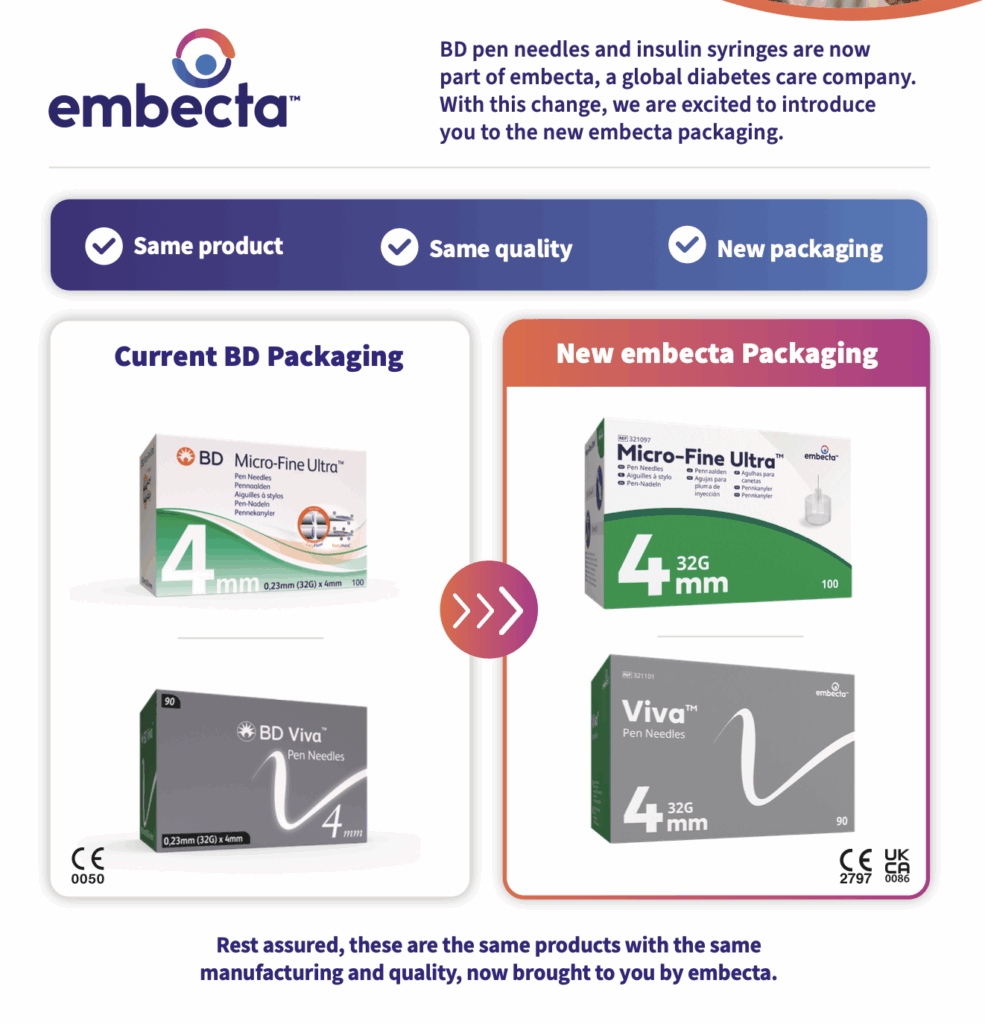 BD pen needles and insulin syringes transitioning to new embecta packaging